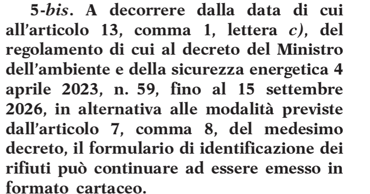 «5-bis. A decorrere dalla data di cui all’articolo 13, comma 1, lettera c), del regolamento di cui al decreto del Ministro dell’ambiente e della sicurezza energetica 4 aprile 2023, n. 59, fino al 15 settembre 2026, in alternativa alle modalità previste dall’articolo 7, comma 8, del medesimo decreto, il formulario di identificazione dei rifiuti può continuare ad essere emesso in formato cartaceo.