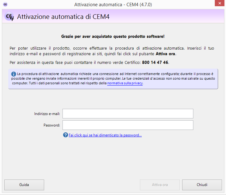 dalla Versione 4.7.0 di Certifico Macchine 4 (04 Marzo 2015) è stata introdotta la procedura di attivazione automatica(*) del software(**).