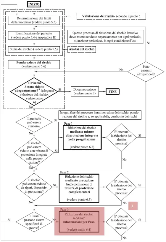 - la valutazione del rischio durante l'utilizzo, vale a dire l'analisi del processo, a partire dall’analisi dei rischi sino alla loro valutazione, deve essere effettuata al fornitore in conformità con la ISO 12100 e/o la IEC 60204-1, quando questa sia applicabile;