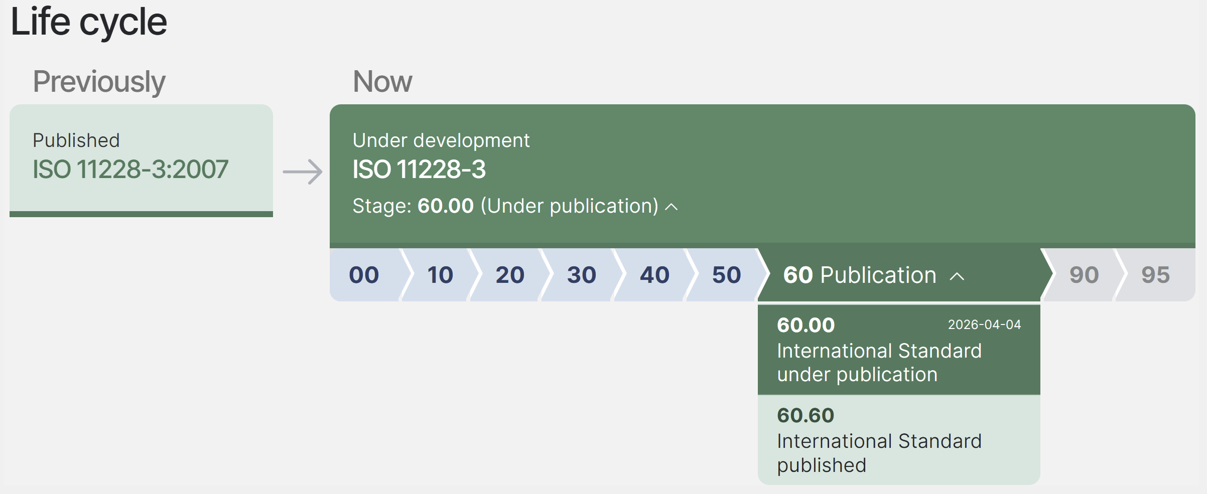 Un aspetto particolarmente rilevante in questa fase è la fase normativa della norma ISO 11228-3. Secondo i codici internazionali armonizzati dell'ISO, la norma si trova nella fase 60.00, corrispondente alla fase di pubblicazione, identificata come "Norma internazionale in fase di pubblicazione". Ciò significa che il documento ha già superato le fasi di proposta, bozza, comitato, consultazione e approvazione formale, e si trova attualmente nella fase editoriale finale prima della sua pubblicazione ufficiale.