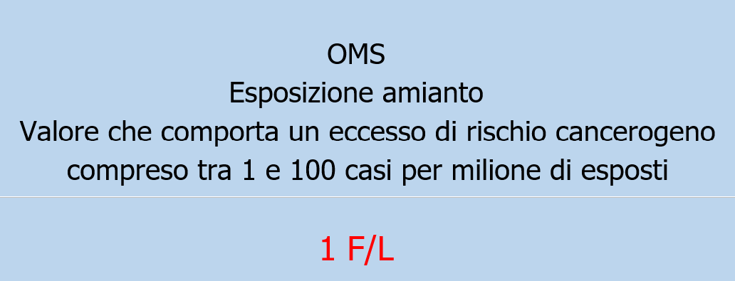 Le linee guida dell’OMS per la qualità dell'aria in Europa (Publications, European Series, N.91 WHO 2000) evidenziano che un'esposizione continuativa per l'intera vita della popolazione generale a 1 F/L (0,001 F/cm3) di amianto, misurata mediante microscopia elettronica a scansione (SEM), comporta un eccesso di rischio cancerogeno compreso tra 1 e 100 casi per milione di esposti.