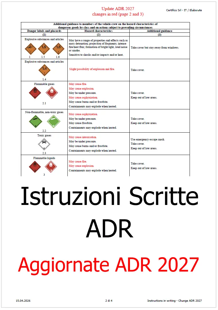 Con l'ADR 2027 previste modifiche alle Istruzioni Scritte (tremcards) Cap. 5.4.3. A seguire le novità. In allegato Modello EN con le modifiche in rosso.
