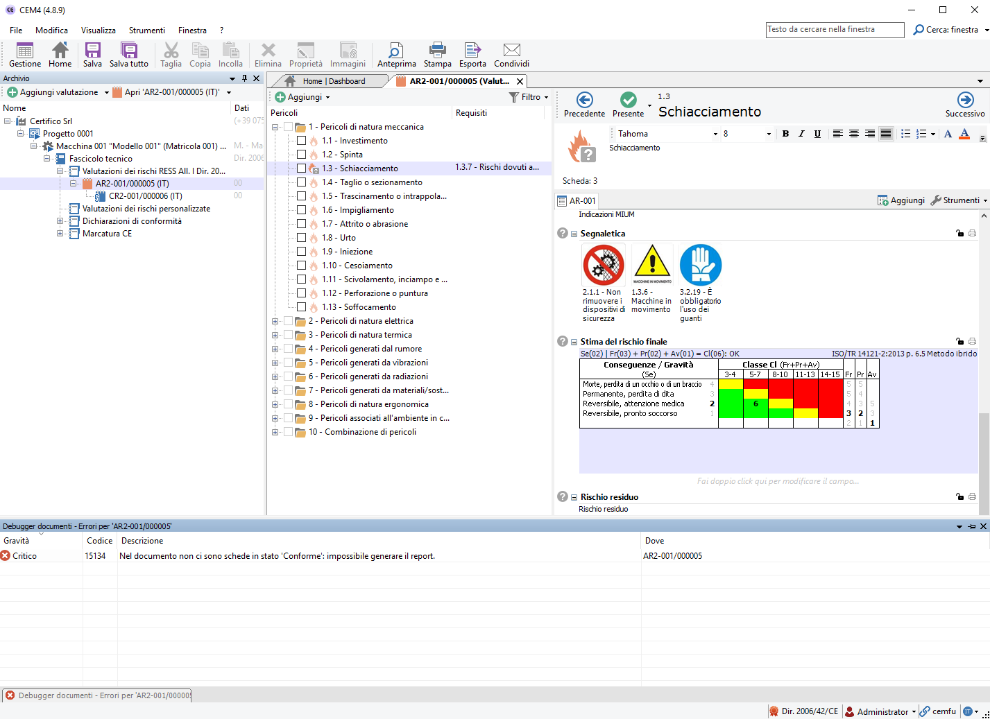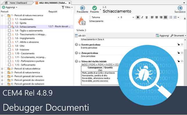 Con il Debugger Documenti, il software CEM4 effettua un controllo "logico" e/o numerico sui campi dei Documenti, in particolare, al momento, sulle schede di Valutazione ed Analisi dei Rischi, segnalando determinate "incongruenze logiche e/o numeriche" afferenti specifici campi dei Report ed ottenendo, in questo modo, dei "Report Debugger"(1).