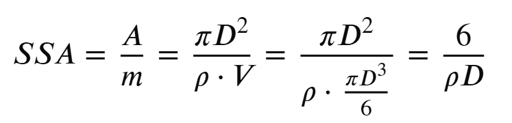 dove D è il diametro della sfera e ρ la densita (rame = 8,96 mg/mm3); SSA in funzione di D è rappresentata dalla curva (iperbole):