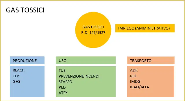 L’"impiego dei gas tossici" è subordinato a quanto prescritto dal R.D. 147/1927 e s.m.i., ma numerose sono le norme correlate alla Sicurezza dei “gas tossici”, in sintesi, dalla “Produzione”, all’”Uso” e al “Trasporto”.