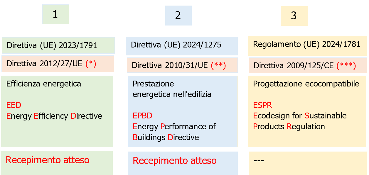 Efficienza energetica: Quadro Direttive UE e recepimenti IT Aggiornamento Gennaio 2026 (Regolamento 2024/1781 - ESPR) ID 11070 | Update Rev. 7.0 del 24 gennaio 2026 Update Rev. 7.0 de 24 gennaio 2026 Regolamento (UE) 2024/1781 del Parlamento europeo e del Consiglio, del 13 giugno 2024, che stabilisce il quadro per la definizione dei requisiti di progettazione ecocompatibile per prodotti sostenibili, modifica la direttiva (UE) 2020/1828 e il regolamento (UE) 2023/1542 e abroga la direttiva 2009/125/CE. (GU L 2024/1781 del 28.6.2024) Update Rev. 6.0 dell'08 maggio 2024 Pubblicata in GU L 2024/1275 dell'8.5.2024, la Direttiva (UE) 2024/1275 del Parlamento europeo e del Consiglio, del 24 aprile 2024, sulla prestazione energetica nell’edilizia, con entrata in vigore il 28.05.2024. Applicazione: Gli articoli 30, 31, 33 e 34 si applicano a decorrere dal 30 maggio 2026 Recepimento Gli Stati membri mettono in vigore le disposizioni legislative, regolamentari e amministrative necessarie per conformarsi agli articoli 1, 2 e 3, da 5 a 29 e 32, nonché agli allegati I, II e III e da V a X entro il 29 maggio 2026. Essi comunicano immediatamente alla Commissione il testo di tali disposizioni nonché una tavola di concordanza. Gli Stati membri mettono in vigore le disposizioni legislative, regolamentari e amministrative necessarie per conformarsi all’articolo 17, paragrafo 15, entro il 1° gennaio 2025. Abrogazione La direttiva 2010/31/UE, come modificata dagli atti elencati all’allegato IX, parte A, è abrogata a decorrere dal 30 maggio 2026, fatti salvi gli obblighi degli Stati membri relativi ai termini di recepimento nel diritto interno e alle date di applicazione delle direttive di cui all’allegato IX, parte B. Update Rev. 5.0 del 20.09.2023 Pubblicata in GU L 231/1 del 20.9.2023 la Direttiva (UE) 2023/1791 del Parlamento europeo e del Consiglio del 13 settembre 2023 sull'efficienza energetica e che modifica il regolamento (UE) 2023/955, con entrata in vigore il 10 ottobre 2023. Recepimento IT: 11.10.2025 Abrogazione Applicazione Update Rev. 4.0 del 09.04.2023 Aggiornato Decreto-Legge 4 giugno 2013, n. 63 consolidato 04.2023. Update Rev. 3.0 del 14.02.2023 Aggiornato Decreto-Legge 4 giugno 2013, n. 63 consolidato 02.2023. Update Rev. 2.0 del 12 Dicembre 2021 In GU n. 294 dell'11 Dicembre 2021 pubblicato il Decreto legislativo 8 novembre 2021 n. 210 Entrata in vigore del provvedimento: 26/12/2021 In allegato Documento completo con tutte le Direttive Efficienza Energetica EED / EPBD / ErPD con modifiche ed atti di recepimento emanati / attesi suddivisi (titolo e linkweb). Il Documento sarà aggiornato nel tempo in relazione alla emanazione di nuovi atti / altre modifiche, tale da avere un quadro di evoluzione normativa / altro aggiornato nel tempo. E' possibile suddividere l'Efficienza Energetica in 3 macro azioni: Generale, Costruzioni/Impianti, Prodotti. A. Quadro generale Direttiva sull'efficienza energetica 2023/1791 (Nuova EED) Pubblicata in GU L 231/1 del 20.9.2023 la Direttiva (UE) 2023/1791 del Parlamento europeo e del Consiglio del 13 settembre 2023 sull'efficienza energetica e che modifica il regolamento (UE) 2023/955, con entrata in vigore il 10 ottobre 2023. La Direttiva (UE) 2023/1791 stabilisce un quadro comune di misure per promuovere l'efficienza energetica nell'Unione al fine di garantire il conseguimento degli obiettivi dell'Unione in materia di efficienza energetica e consente ulteriori miglioramenti dell'efficienza energetica. Tale quadro comune ha lo scopo di contribuire all'attuazione del regolamento (UE) 2021/1119 del Parlamento europeo e del Consiglio e alla sicurezza dell'approvvigionamento energetico dell'Unione riducendone la dipendenza dalle importazioni di energia, compresi i combustibili fossili. La Direttiva (UE) 2023/1791 stabilisce norme idonee a rendere l'efficienza energetica una priorità in tutti i settori, a rimuovere gli ostacoli sul mercato dell'energia e a superare i fallimenti del mercato che frenano l'efficienza nella fornitura, nella trasmissione, nello stoccaggio e nell'uso dell'energia. Prevede inoltre la fissazione di contributi nazionali indicativi in materia di efficienza energetica per il 2030. La Direttiva (UE) 2023/1791 contribuisce all'attuazione del principio che pone l'efficienza energetica al primo posto, aiutando così anche a trasformare l'Unione in una società inclusiva, giusta e prospera, dotata di un'economia moderna, efficiente sotto il profilo delle risorse e competitiva. I requisiti stabiliti dalla Direttiva (UE) 2023/1791 sono requisiti minimi e non impediscono ai singoli Stati membri di mantenere o introdurre misure più rigorose. Tali misure devono essere conformi al diritto dell'Unione. Qualora la normativa nazionale preveda misure più rigorose, gli Stati membri la notificano alla Commissione. Note modifica / recepimenti riportati in allegato XVI della Direttiva (UE) 2023/1791 La direttiva 2012/27/UE, come modificata dagli atti di cui all'allegato XVI, parte A, è abrogata a decorrere dal 12 ottobre 2025, fatti salvi gli obblighi degli Stati membri relativi ai termini di recepimento nel diritto interno delle direttive di cui all'allegato XVI, parte B. Allegato XVI Parte A Direttiva abrogata ed elenco delle modifiche successive (di cui all'articolo 39)