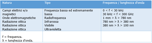 Ai fini della presente norma, la classificazione delle radiazioni in base alla frequenza e alla lunghezza d'onda o energia è fornita nel prospetto seguente.
