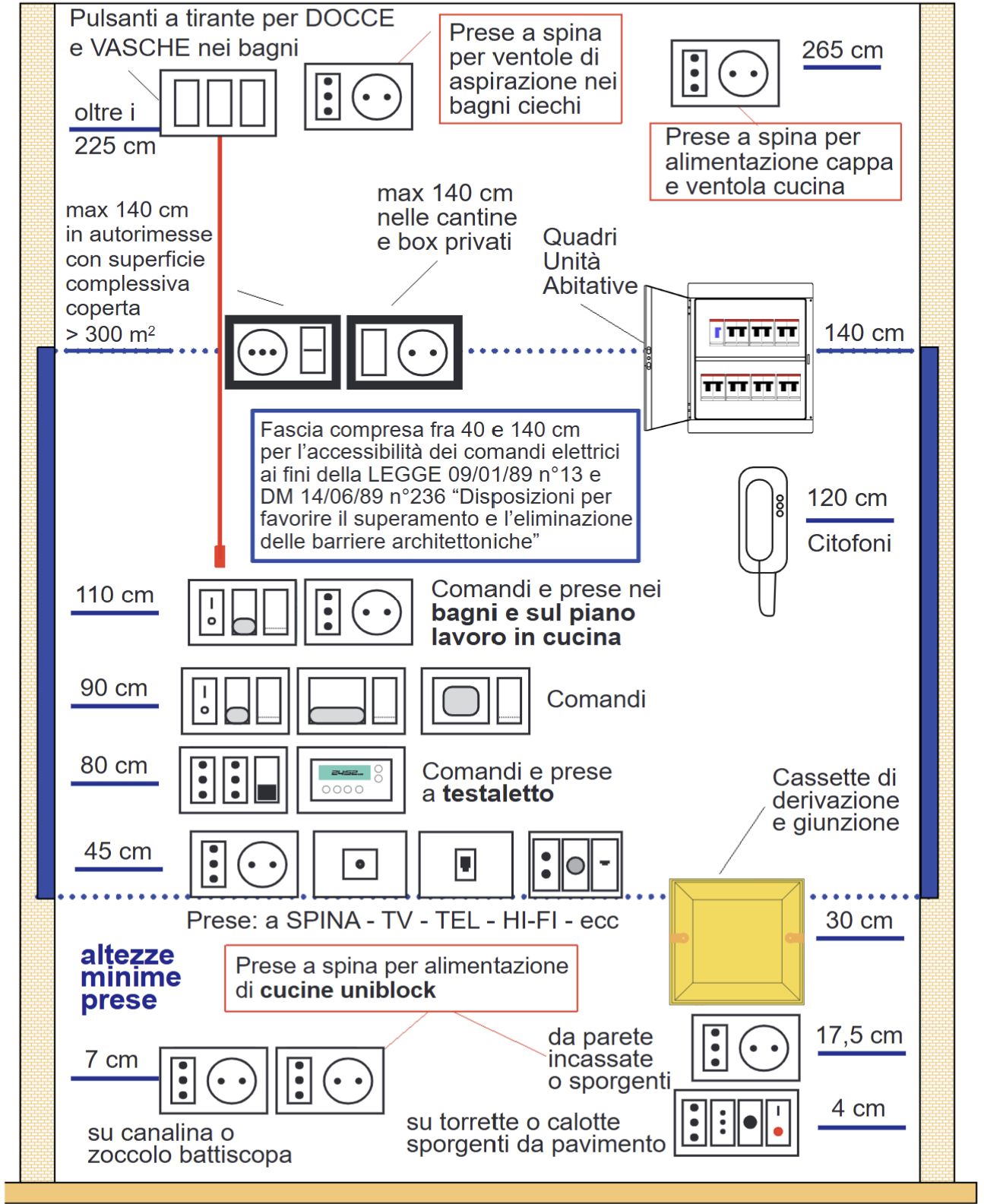 2.9.2 Disposizioni delle apparecchiature elettriche per l’eliminazione delle barriere archi tettoniche In tutte le unità abitative, ambienti, e parti comuni degli edifici in cui è richiesto per legge l’abbattimento delle barriere architettoniche (legge 13 del 9/1/89), i componenti elettrici (quadri generali, interruttori, prese, campanelli, pulsanti, citofoni, ecc) necessari alla libera fruizione degli spazi e delle attrezzature in essi contenute, devono essere accessibili anche a persona su sedia a ruote.