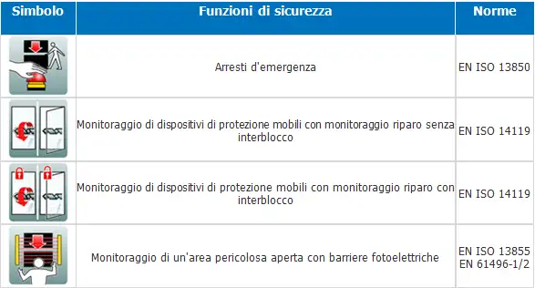 Di seguito sono elencate le funzioni di sicurezza più comuni con le relative norme: