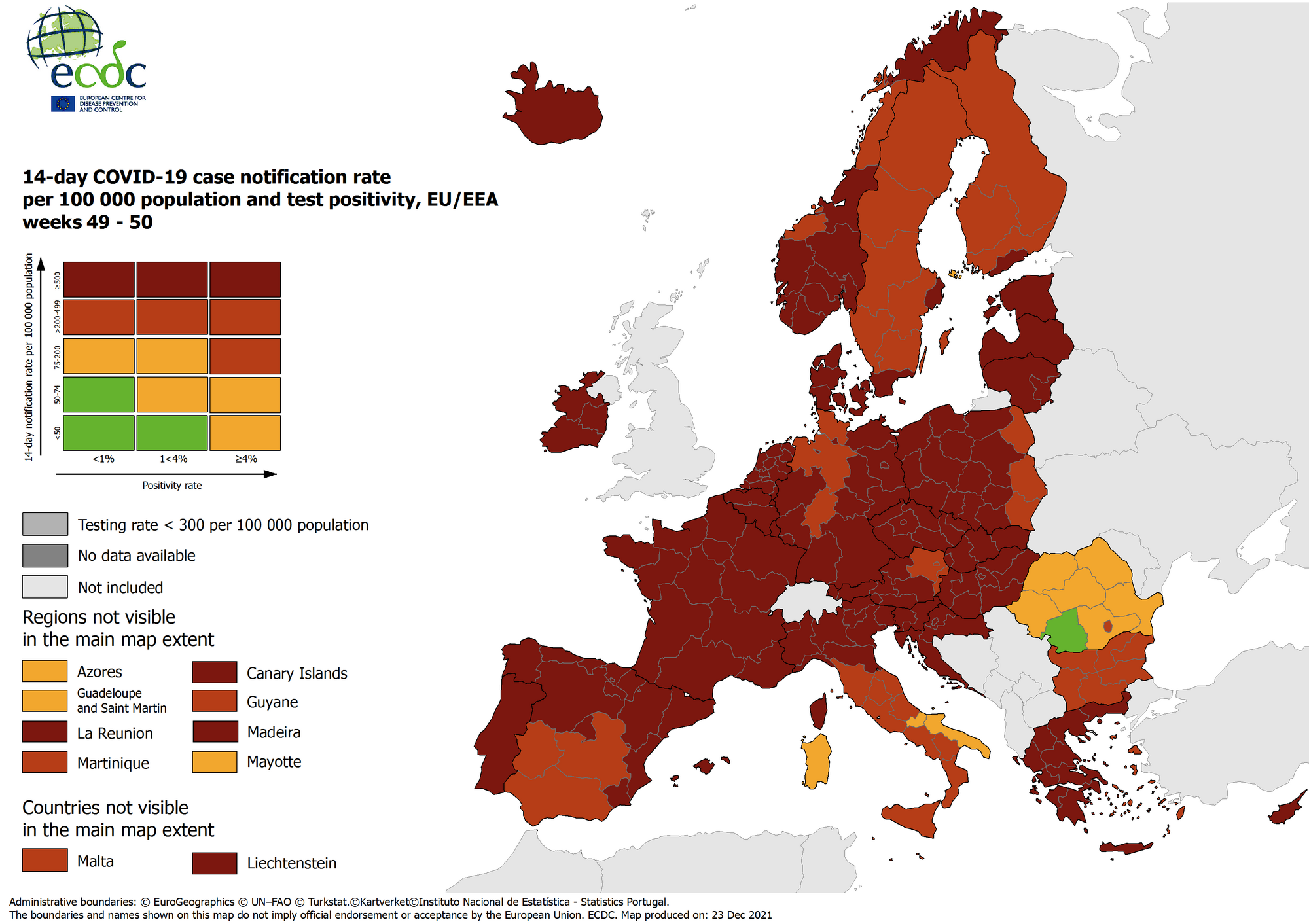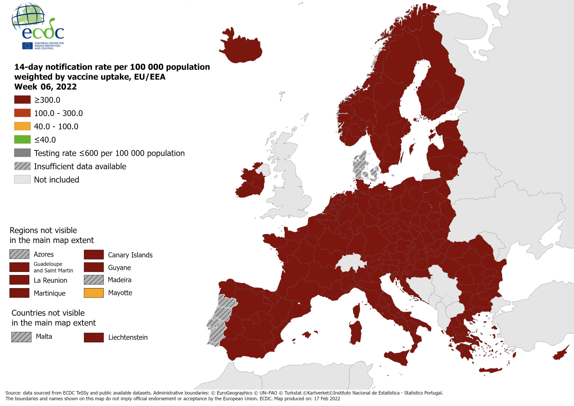 L'ECDC pubblica ogni giovedì mappe e dati sulla pandemia di COVID-19 in tutta l'UE/SEE. Una relazione completa sull'attuale situazione epidemiologica negli Stati membri dell'UE/SEE può essere trovata nel rapporto di panoramica settimanale per paese dell'ECDC. Ulteriori indicatori epidemiologici e analisi dei dati COVID-19 possono essere trovati qui. Nelle mappe seguenti, gli Stati membri dell'UE/SEE sono classificati in base a un indicatore basato sul tasso di notifica a 14 giorni, ponderato in base all'adozione del vaccino nella regione. Formula per l'indicatore: